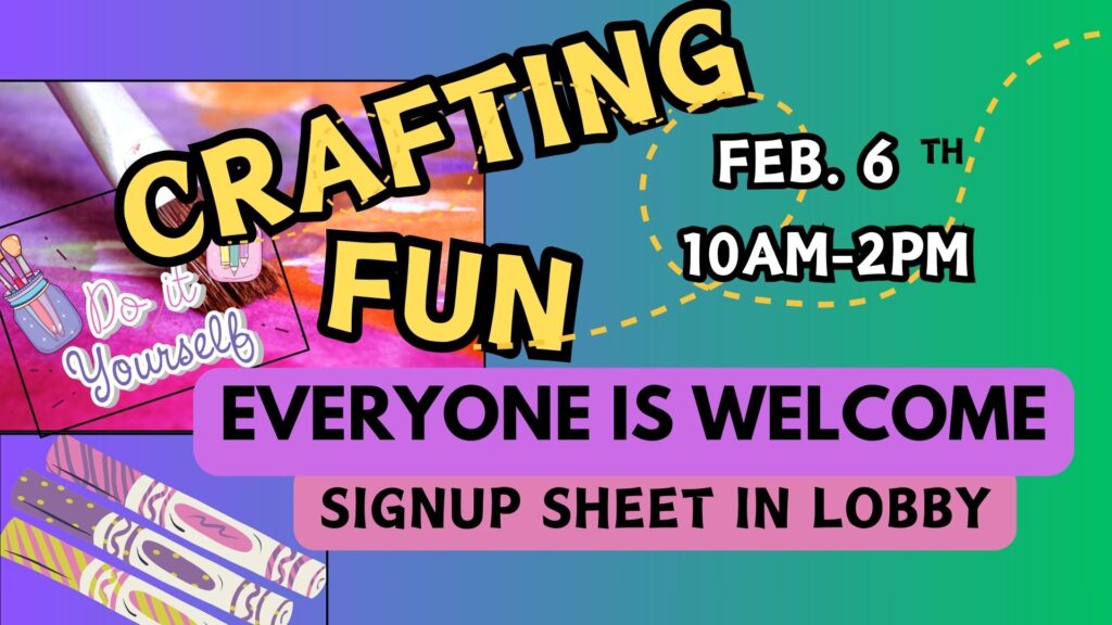 The Crafters are back in action.  The first meeting will be on February 6, 2026- 10:00am-2:00pm