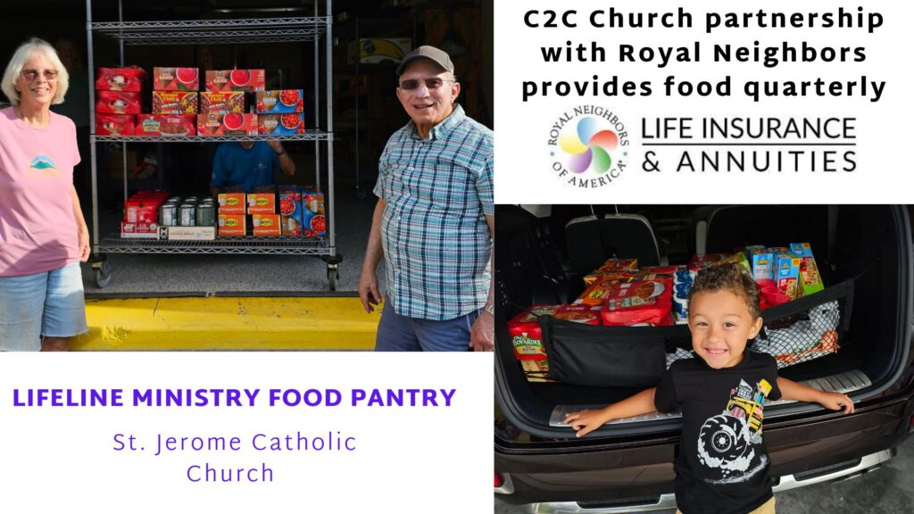 C2C Church enjoys our connection with Royal Neighbors. We currently have 23 members that actively make up our chapter-20184. Each member volunteers many quarterly hours to support and love our community. The C2C Royal Neighbors chapter has a quarterly commitment to supply $400 worth of food to Saint Jerome Lifeline Ministry- Food Pantry. The Royal Neighbors chapter also partners with C2C Missions on a regular basis to be the arms, legs and hearts of Christ back into the community.