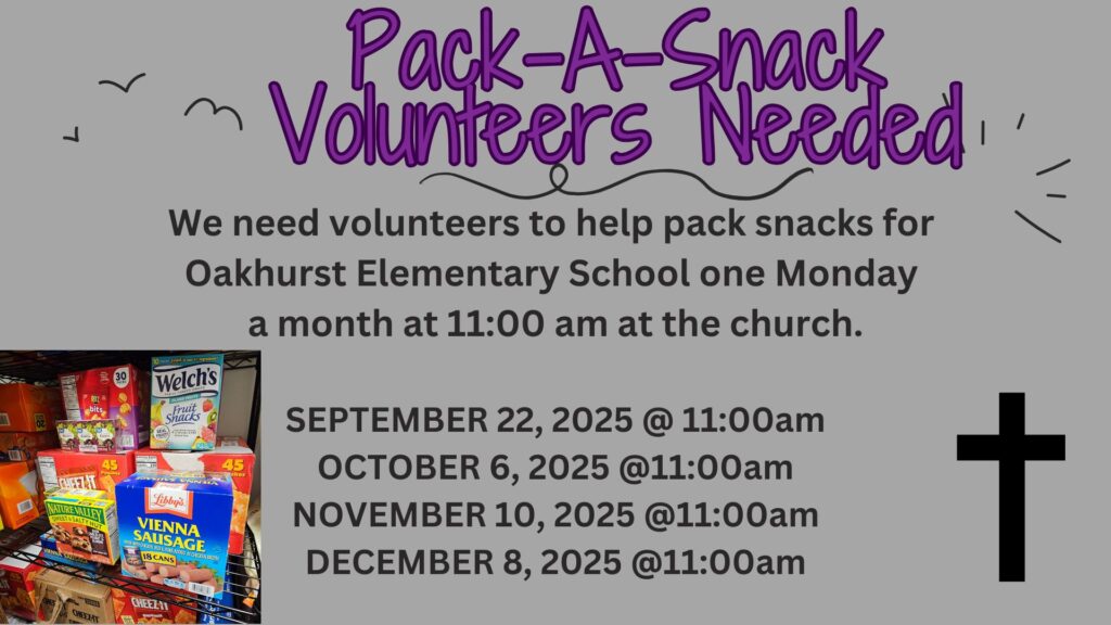 This is an ongoing food collection that involves the support of our congregation. There are 15 families presently that will benefit this school year. If you are interested in donating to this outreach you can either bring these items to church or see Toni Eldred.