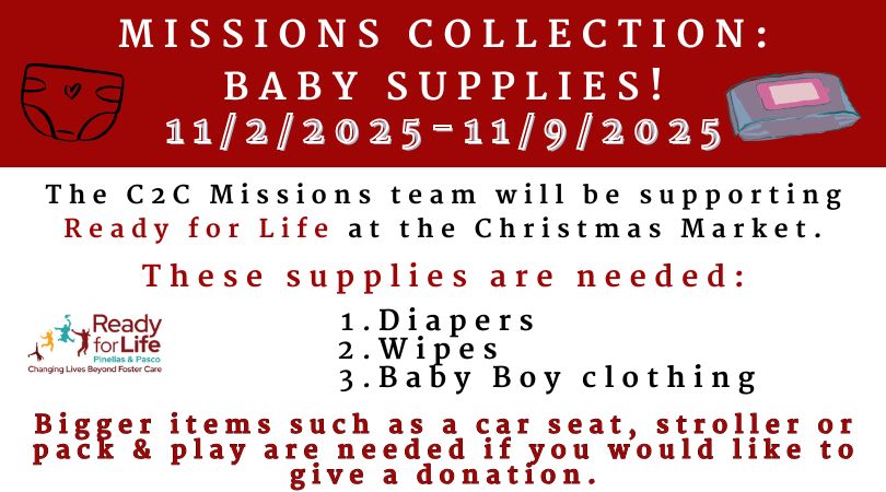 The C2C Missions Team supports the following within our community (in addition to those listed within the quarterly outreaches): Tampa Bay Pro-Life Alliance, the Hispanic Outreach Center, Rabbi Ron Speaks, Women With Purpose, & Shepherd’s Village. We also support Truck Stop Ministries on a national level and the Gideons and World Vision on a Global level.