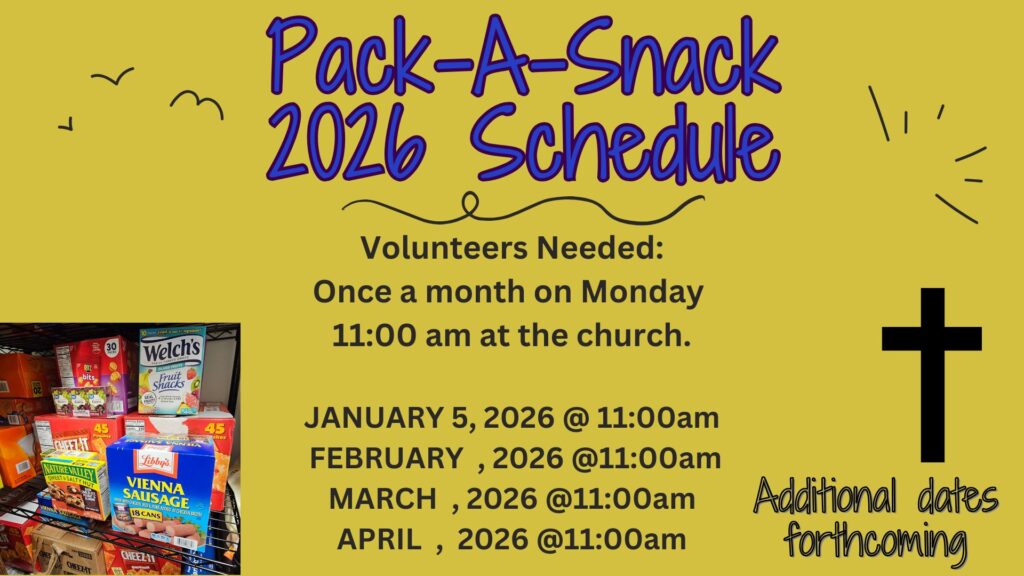 This is an ongoing food collection that involves the support of our congregation. There are 15 families presently that will benefit this school year. If you are interested in donating to this outreach you can either bring these items to church or see Toni Eldred.